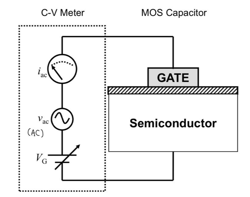 위 그림은 MOSCAP에서 capacitance measurement에 관한 그림입니다. v_ac는 AV전압, V_G는 DC전압입니다.