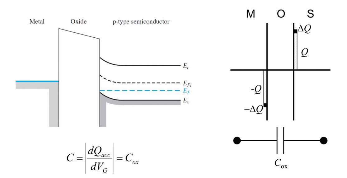metal쪽 표면과 semi쪽 표면에만 carge들이 존재하기에, 마치 oxide에 cap이 존재하는 것 처럼 보이게 되는 것이죠.