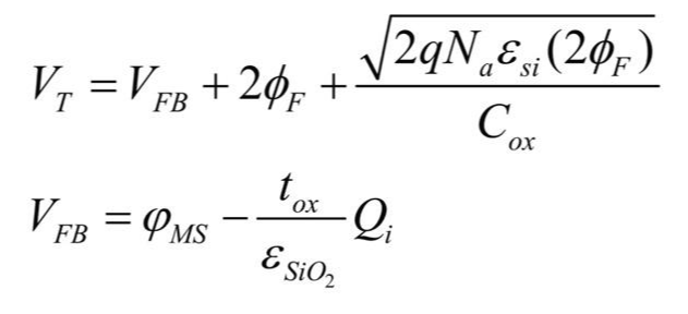 위와 같이 V_FB를 표현할 수 있고, 우리가 알고 있는 V_T식을 V_FB에 관하여 변환한 뒤 대입하면 다음과 같이 Q_i를 구할 수 있습니다.