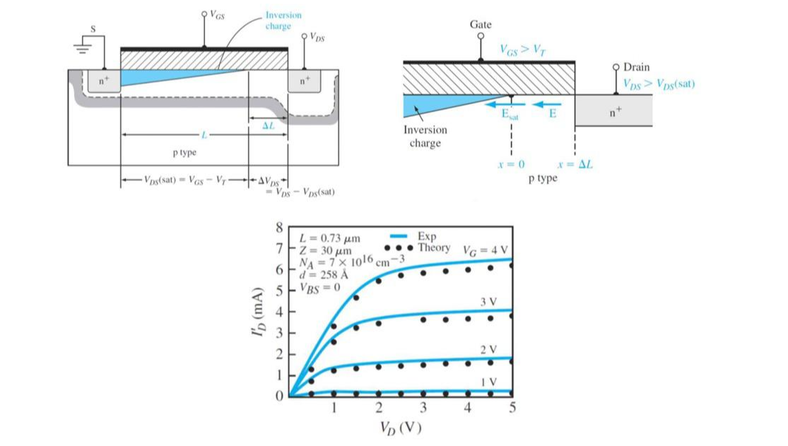 위 수식을 통해 saturation current는 L에 의존하지 않고, (V_G-V_T)에 비례함을 확인할 수 있습니다.