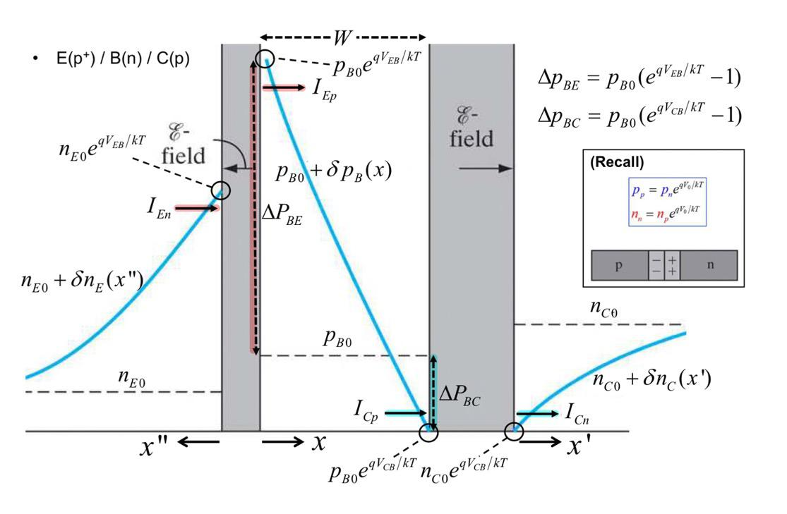 위에서 말했듯이, BJT에서는 minority carrier의 흐름이 중요하기 때문에, 다음 그림이 중요할 것 같네요