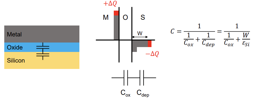 이때는 추가적으로 Silicon에 cap이 형성되는데, 이 cap은 gate bias에 민감하게 반응하면서 depletion영역이 생성되면서 만들어 집니다.