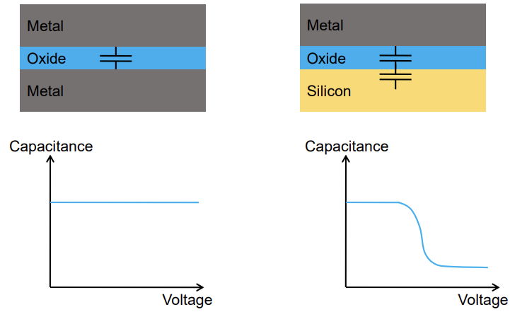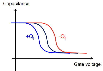이미 oxide내부에 있기 때문에, 전하의 종류에 따라 voltage와 C의 관계가 변하게 됩니다.