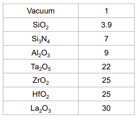 k가 높을수록 capacitance는 증가하고, 물질마다 다른 k값을 가지고 있기에 원하는 값을 가진 물질을 골라 사용할 수 있습니다.