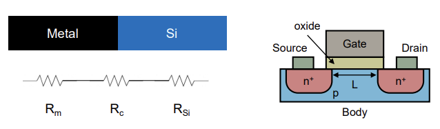 MOSFET의 source와 drain에 보면, Metal과 Silicon이 맞닿아 있는 영역에 저항이 생기게 되는 것이죠.