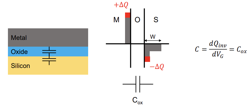 오른쪽은 MOS구조입니다. 위와 동일하게 oxide에 C_ox가 있습니다.