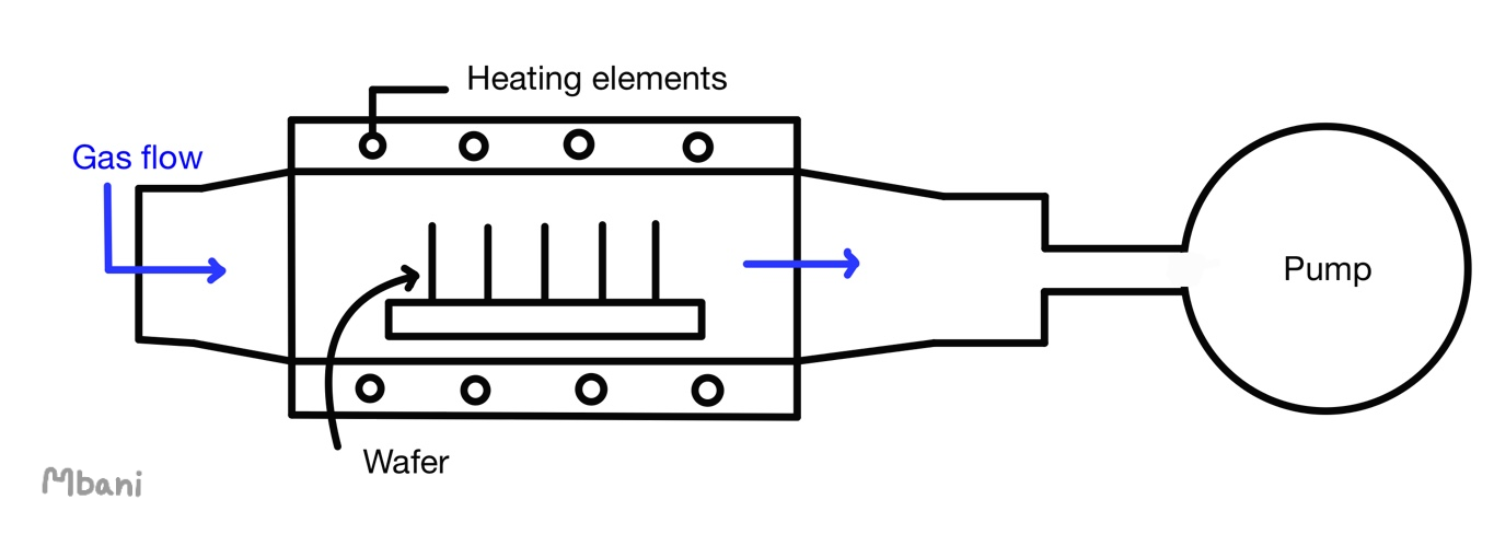 위 그림은 CVD를 실행하는 chamber의 모습입니다. pump는 기체를 빨아들여 chamber의 내부의 압력을 유지시키기 위해 사용됩니다. wafer와 gas는 내부를 heating시켜 반응이 일어납니다. 이때 과정을 진행하는 chamber의 압력에 따라서 생성되는 박막의 종류도 변화하는데, 대기압에서는 APCVD, 낮은 압력(거의 진공상태)에서는 LPCVD, Plasma를 이용하면 PECVD라고 부릅니다.