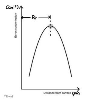 이 과정은 말 그래도 Ion Implantation 이온 주입을 말합니다. 불순물인 이온 beam을 전기장으로 가속시켜 Si wafer의 표면에 이 이온을 때려 박는(?) 과정입니다. 이온이 wafer에 박힌다는 것은 바로 doping이 되었다는 것을 알 수 있습니다. 이렇게 doping된 불순물들의 분포(distribution of implanted impurities)를 보여주는 그래프는 아래와 같습니다. Rp는 불순물이 가장 분포가 많이 되어있는 거리를 나타냅니다.