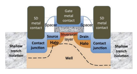halo를 substrate와 같은 종류에 doping농도가 더 높은 물질을 Source와 Drain영역에 붙여줌으로서
