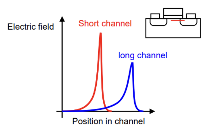 channel의 길이가 짧아지면서 maximum E-field의 위치가 drain junction의 앞단에 걸리고,