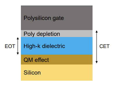 CET는 Capacitance equivalent thickness로, MOSCAP을 형성했을 때, 그 사이 형성되는 전체 영역을 고려한 두께가 됩니다.