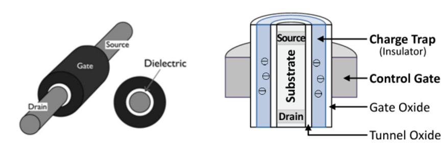 control gate가 둘러싸여 있고, oxide와 Si body가 안에 들어있습니다.