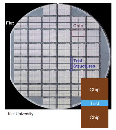 chip을 구성하고 있는 단위 transistor를 넣어두어 wafer의 역할을 측정해낼 수 있는 test structures영역으로 말이죠.