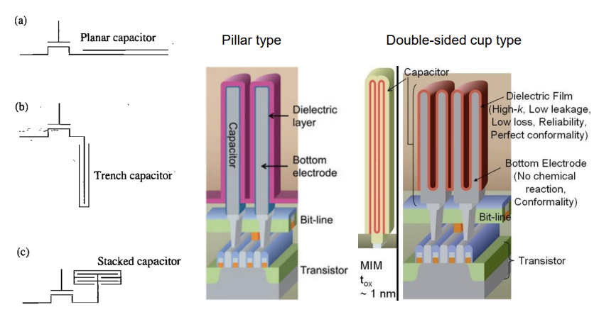 현재는 Stacked capacitor를 많이 사용하고 있고 이들을 더욱 발전시킨 것이 오른족 두 그림입니다.