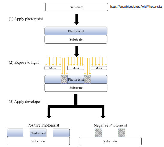 UV에 민감한 Photoresist(PR)을 사용하고 다음과 같은 과정을 따릅니다.