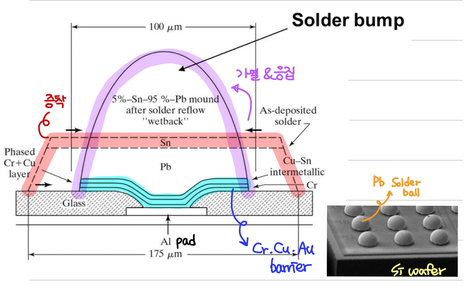 Flip-chip tech.는 각 bonding pad의 윗면에 solder ball을 형성한 뒤, Cr, Cu, Au를 sandwich로 layer를 쌓아 형성하는 방법 입니다.