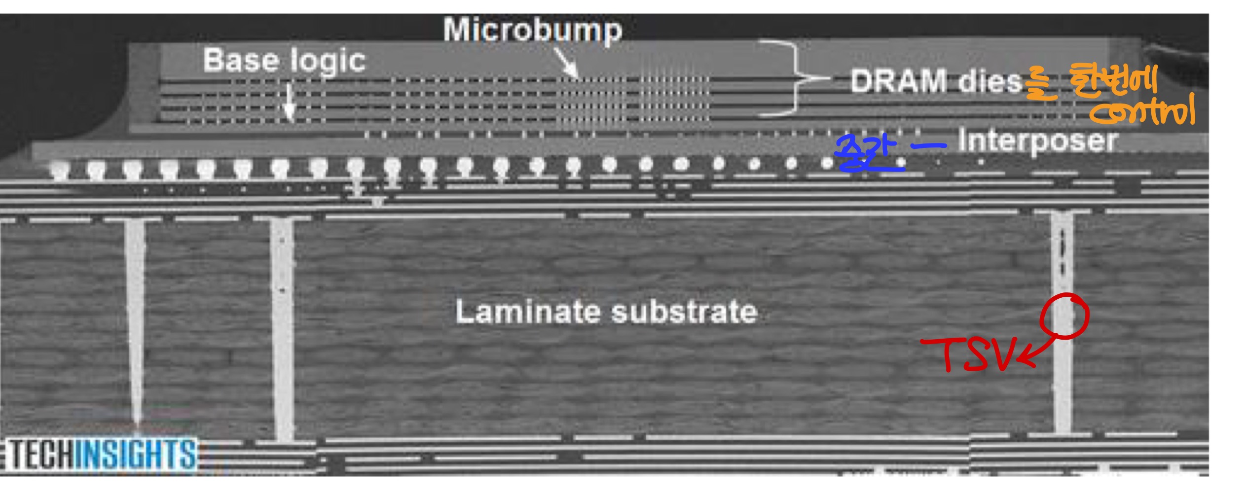 TSV는 through Silicon Via로, Si를 뚫어 연결하는 방법입니다.