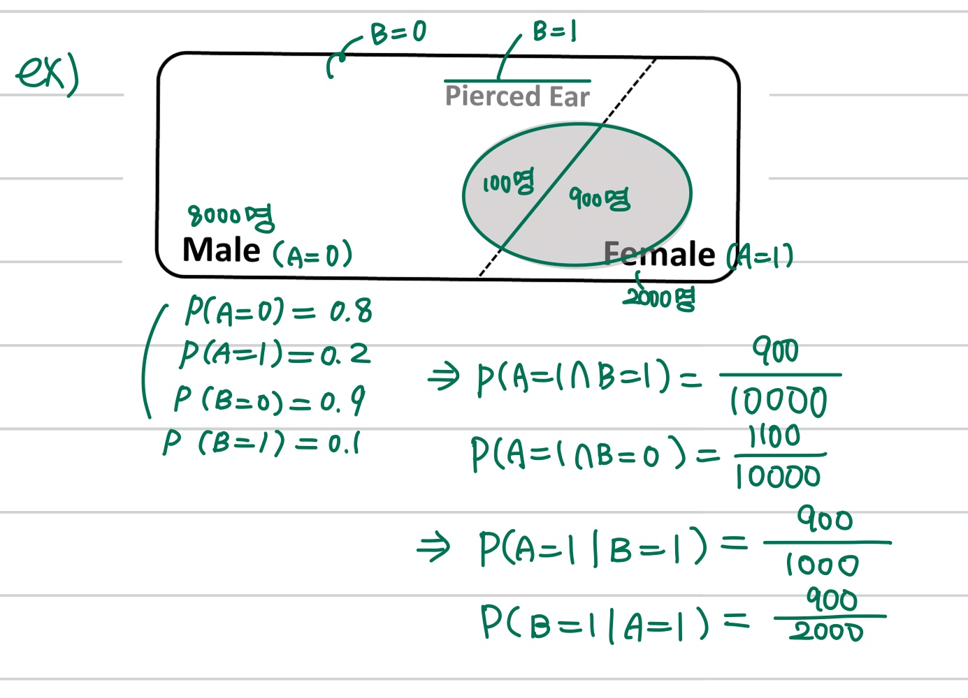 남자 중 피어싱을 한 사람이 100명, 여자 중 피어싱을 한 사람이 900이라 하면