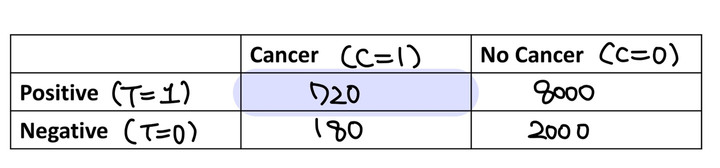 음성을 T=0, 양성을 T=1, 암이 걸리지 않았을 때를 C=0, 암에 걸렸을 때를 C=1이라 가정하면.