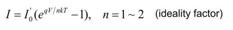 그리고 V의 감소는 I의 증가에 따라 천천히 일어남을 알 수 있고, I가 증가하면 carrier injection이 증가하게 되면서 R이 감소하게 되기 때문에 constant하지 않고 I에 따라 결정됨을 위 식을 통해 알 수 있습니다.