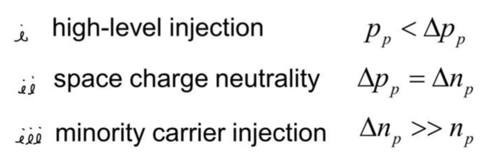 위와 같은 상황을 High-level injection이라고 합니다. 높은 carrier의 주입으로 늘어난 농도가 기존 농도보다 높아졌을 때의 상황을 말합니다.