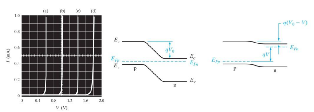 결론적으로 band gap이 클수록 forward bias가 커야만 폭발적으로 전류가 증가할 수 있게 됩니다.