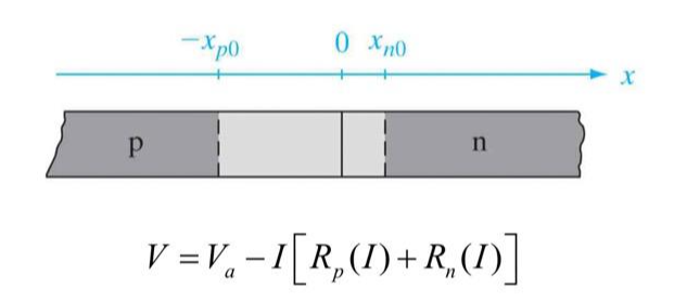 p형에 걸린 저항을 R_p, n형에 걸린 저항을 R_n이라 하고, junction에 걸린 전압을 V, 위 diode 전체에 걸린 전압을 V_a라 하면, 위와 같은 식으로 junction voltage를 나타낼 수 있습니다.