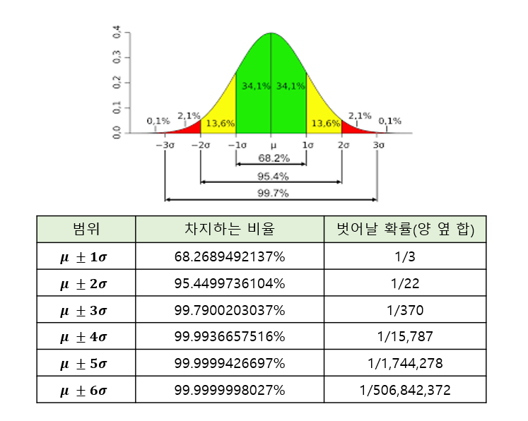 시그마에 따른 범위를 통해 벗어날 확률을 확인할 수 있습니다.