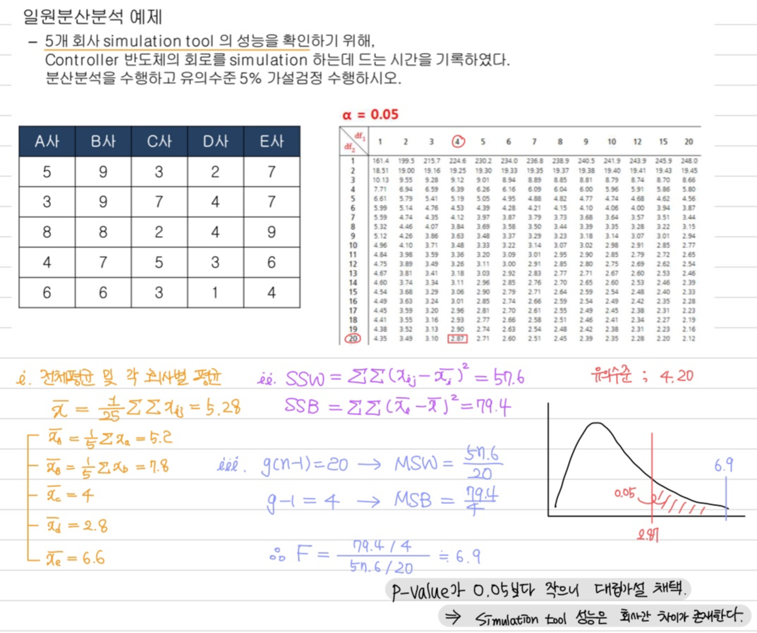 둘을 각각 자유도로 나누어 MSB와 MSW를 구한 후 나오는 F-value값과 유의수준(F.INV(0.95, 자유도, 자유도))를 비교해
